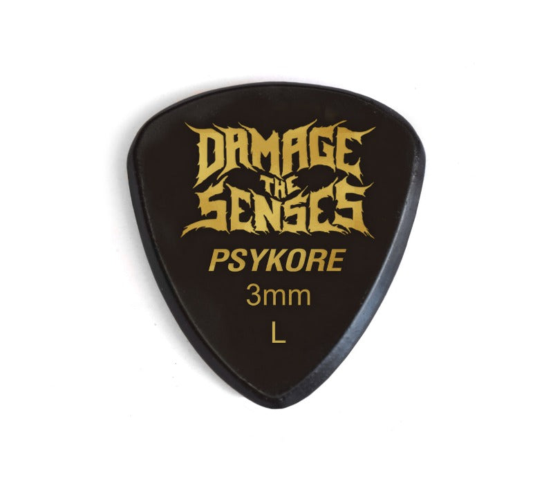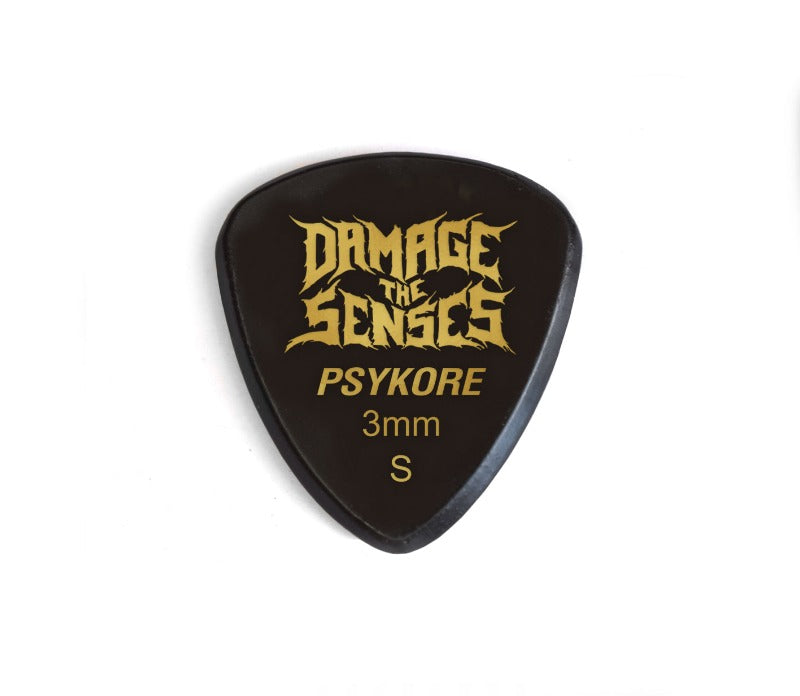 Damage The Senses picks are constructed from 3mm thick Acrylic featuring an etched & painted logo giving the pick extra grip. Acrylic is a hard, long lasting – slow wearing material.