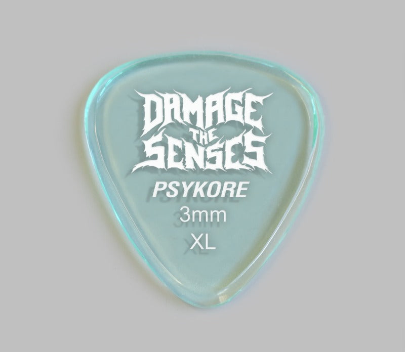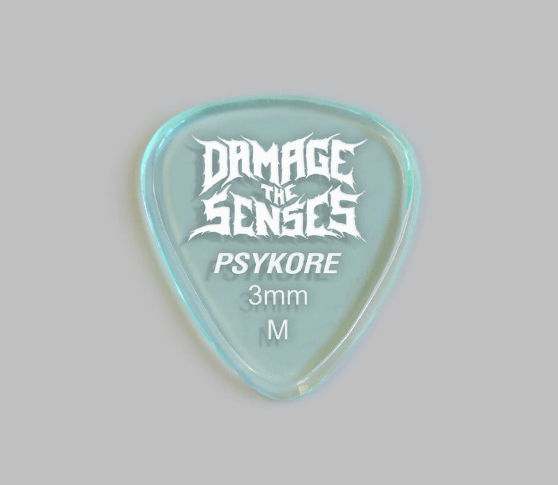 Damage The Senses picks are constructed from 3mm thick Acrylic featuring an etched & painted logo giving the pick extra grip. Acrylic is a hard, long lasting – slow wearing material.