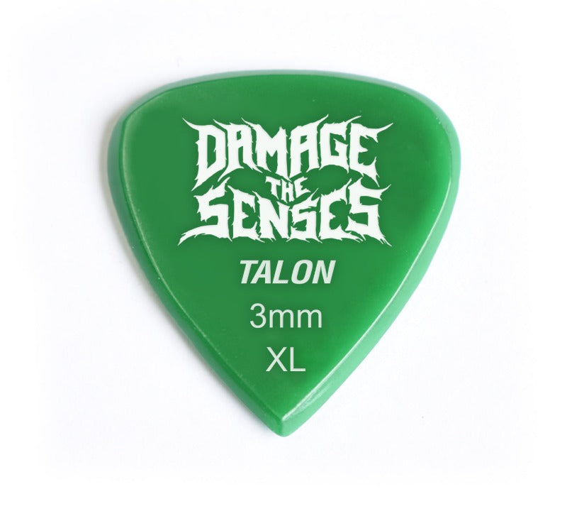 Damage The Senses picks are constructed from 3mm thick Acrylic featuring an etched & painted logo giving the pick extra grip. Acrylic is a hard, long lasting – slow wearing material.