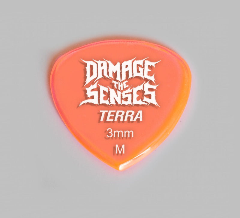 Damage The Senses picks are constructed from 3mm thick Acrylic featuring an etched & painted logo giving the pick extra grip. Acrylic is a hard, long lasting – slow wearing material.