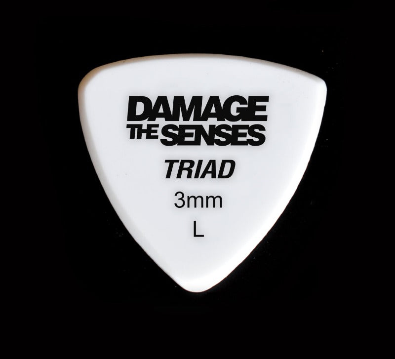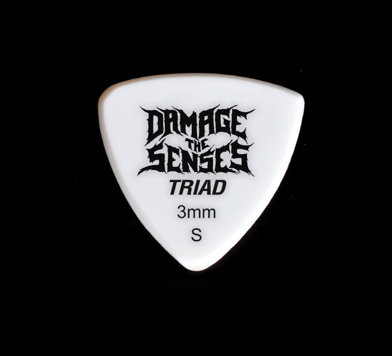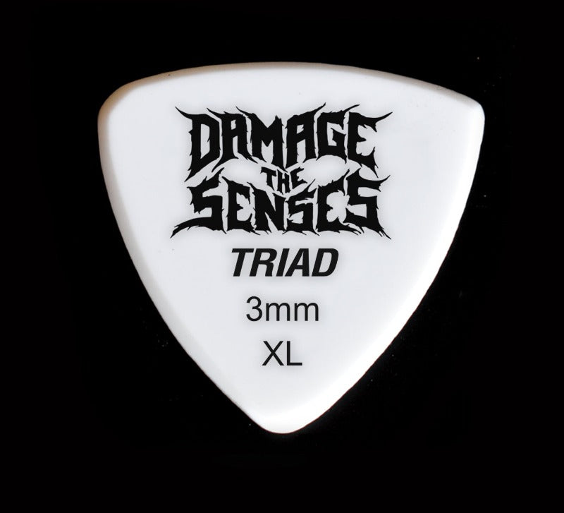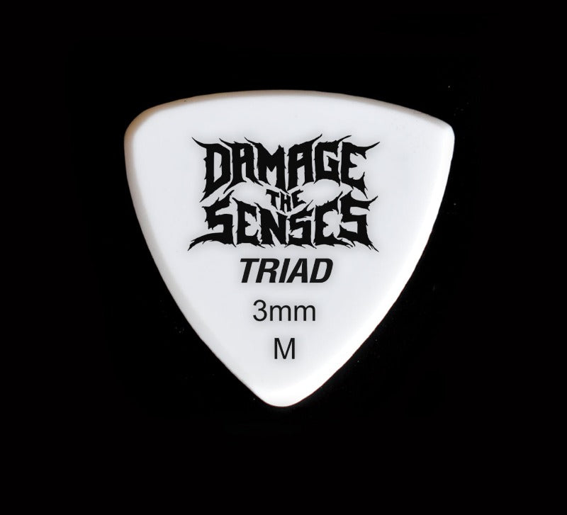 Damage The Senses picks are constructed from 3mm thick Acrylic featuring an etched & painted logo giving the pick extra grip. Acrylic is a hard, long lasting – slow wearing material.