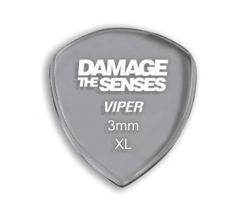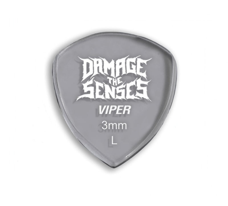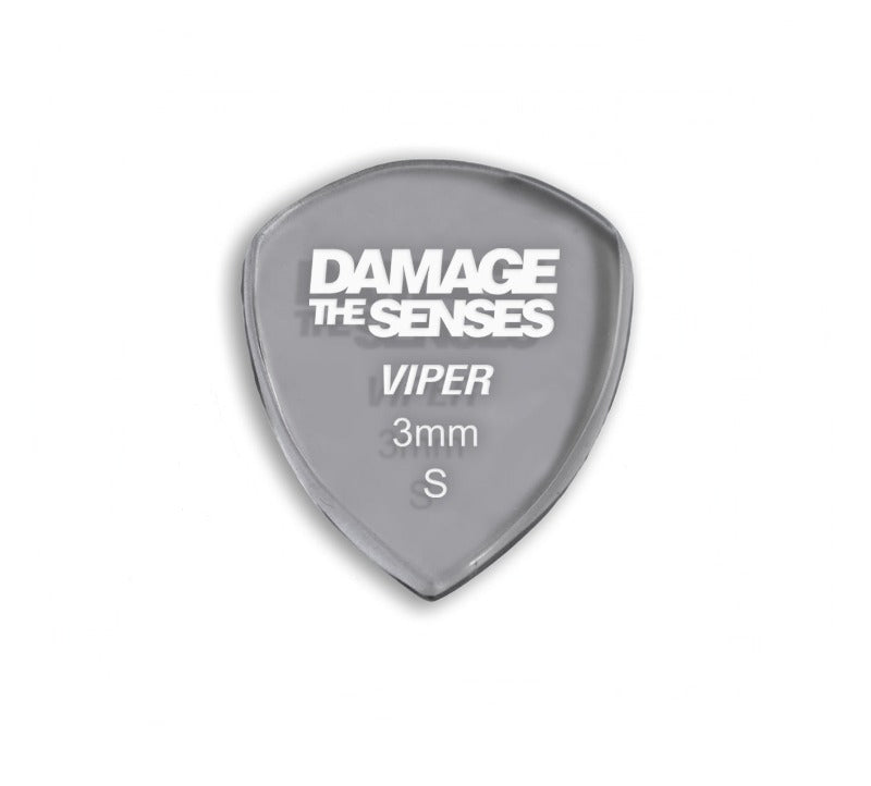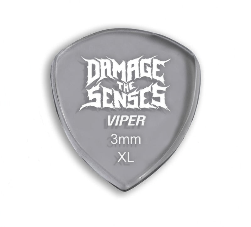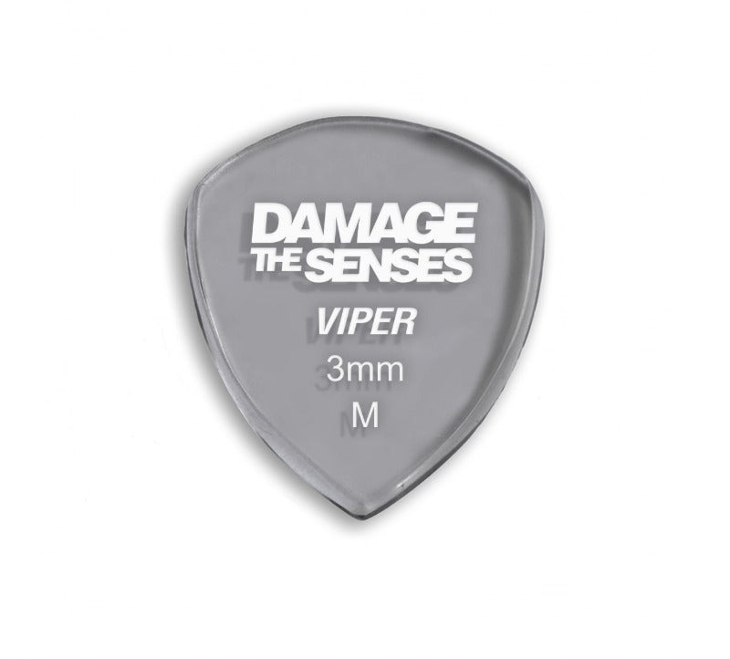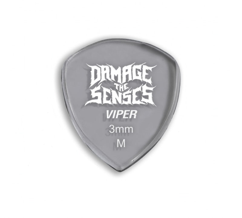 Damage The Senses picks are constructed from 3mm thick Acrylic featuring an etched & painted logo giving the pick extra grip. Acrylic is a hard, long lasting – slow wearing material.
